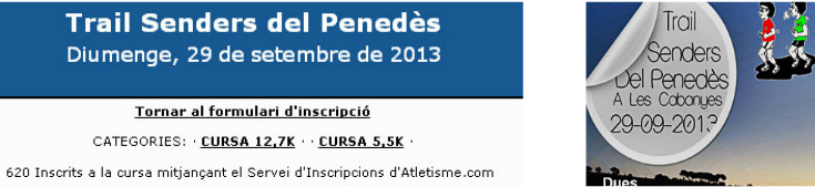 Si fa uns dies anunciàvem que la 2ona Trail Senders del Penedès (Les Cabanyes) que es celebra el proper 29-9-13, batia el record de inscrits al superar els que van tenir l’any passat amb més de 505, ara diem que ja ha superat la barrera dels 600 inscrits amb 620 en aquest moments, en qüestió de 5 dies ha hagut 100 inscripcions i va continuant pujant, encara queden dies per tancar-les, a la cursa llarga de 12,7 kms hi ha 479 inscrits i a la curta de 5’5 kms 141 inscrits.