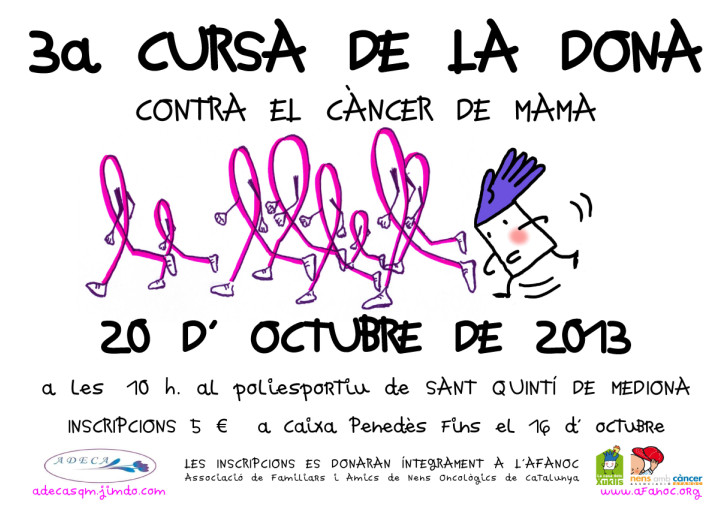 Per 3r any l’associació de dones ADECA de Sant Quintí de Mediona organitzem el dia 20 d’ Octubre la 3a CURSA DE LA DONA per recaptar fons per projectes relacionats amb el càncer.