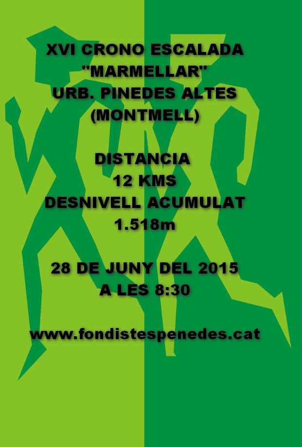 La 16 Crono Escalada Marmellar, començarà a les 8,30 del matí del 28 de juny, pel tema de la calor, la sortida i arribada serà a la urbanització Pinedes altes (Montmell) al costat d’Aiguaviva al carrer Principal, al costat del restaurant i piscines de la urbanització, on hi ha aparcament per a tothom, els atletes aniran sortint de dos en dos.