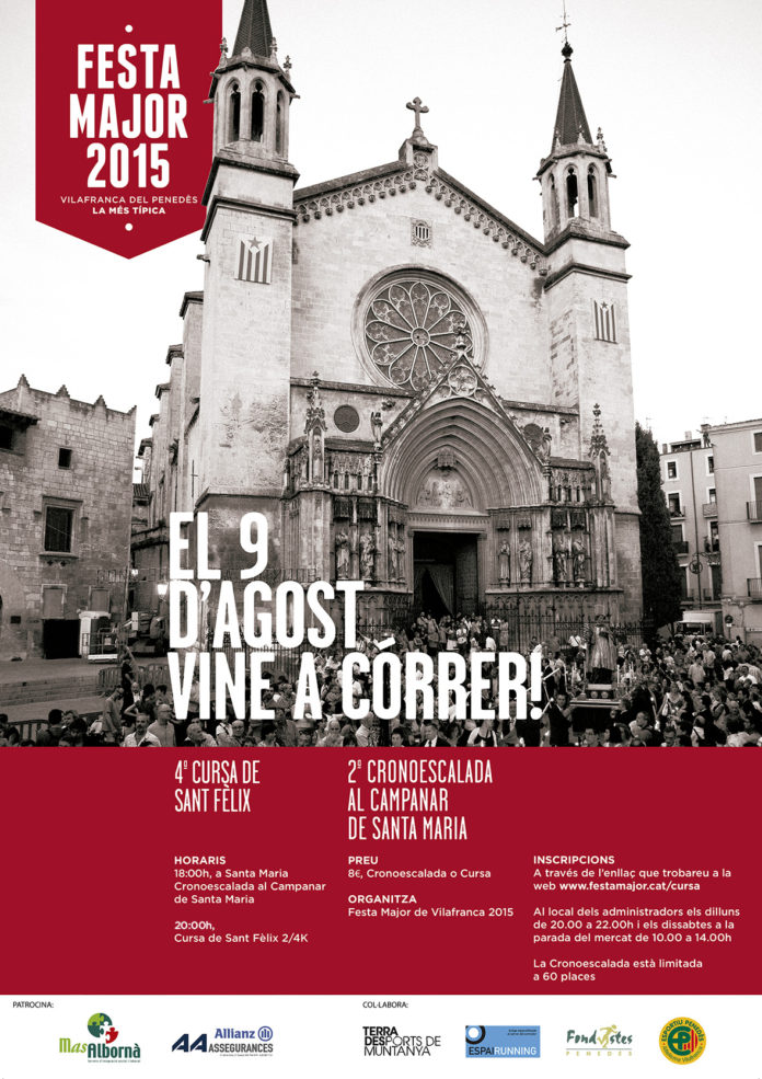 Torna un any més la Cursa de Sant Félix, Quan les iniciatives es consoliden es converteixen en tradicions. Així arribem a la quarta cursa de Sant Fèlix enguany que tindrà lloc el pròxim 9 d’agost. Aquest any la cursa se celebrarà un diumenge. La cursa de Sant Fèlix, emmarcada dins dels múltiples actes previs de la nostra festa gran, any rere any va superant-se en nombre de participants. Primer però, celebrarem la segona edició de la Cronoescalada a Santa Maria – un altre acte que va començar amb força en la seva primera edició. Els participants gaudiran d’unes vistes privilegiades en arribar a la meta perquè podran contemplar el paisatge vilafranquí des de dalt del campanar de Santa Maria.