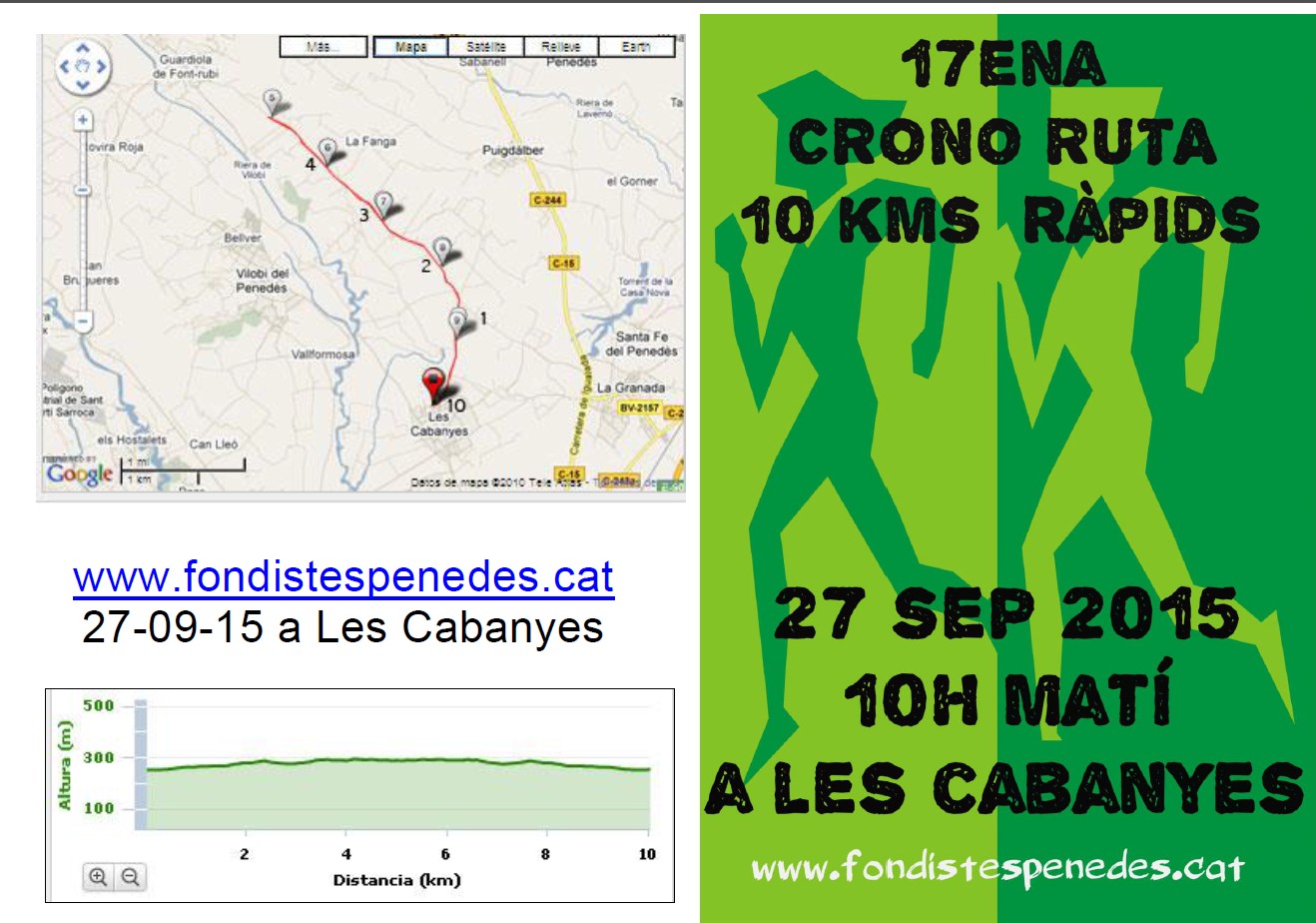 Com cada temporada Fondistes Penedès celebra la clàssica Crono Ruta que com és habitual els últims anys serà a les Cabanyes en un circuit una mica ondulat però ràpid i propici per fer bones marques, anant per la Carrerada fins quasi arribar a Guardiola a on està el km 5 aquí atletes giraran per tornar a les Cabanyes.