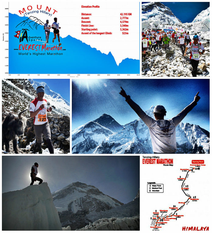 La marató de l’Everest és la marató amb més altitud del mon, la línea de sortida està a 5.362m d’alçada molt a prop del camp base de l’Everest i va al poblat sherpa de Bazar Namche a 3.446m. Quasi tot el recorregut és pendent descendent tot i que hi ha dues duríssimes pujades que posen al atletes al límit per la capacitat pulmonar.