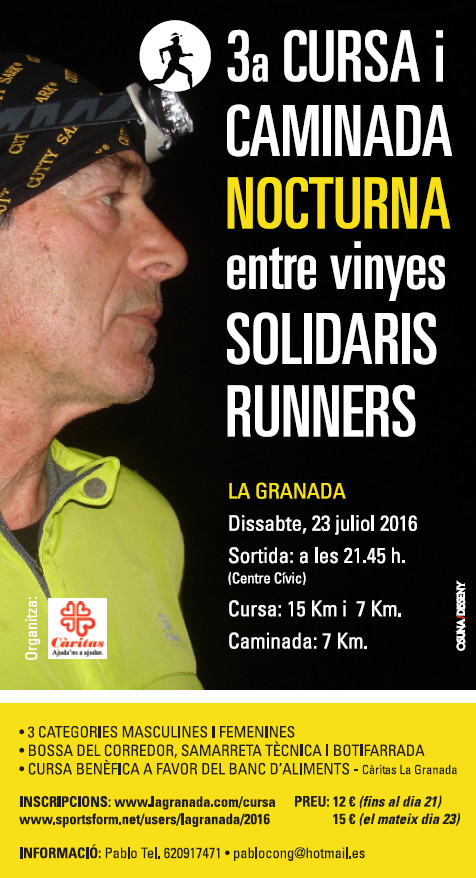 El grup Solidaris Runners de la Granada , organitza una cursa i caminada solidària a favor de la recentment creada unitat de Càritas. Els beneficis aniran íntegrament destinats a favor del banc d’aliments (Càritas). El circuit transcorre per l’entorn natural del municipi de La Granada i rodalies. La major part es fa per terra, per camins envoltats de vinyes, bosc i corriols. El circuit té dos recorreguts de 15 i 7 km el quals estaran marcats amb cinta i guix, així com els punts kilomètrics.