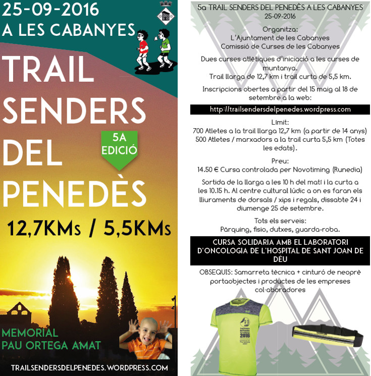 Ja estan obertes les inscripcions de la 5ena edició de la Trail Senders del Penedès (Les Cabanyes) , la cursa tindrà lloc el 25 de setembre, el preu de les inscripcions per les dues distancies serà de 14,5 euros, aquesta edició la cursa serà controlada per Novotiming (Runedia), amb dorsal/xip d’un sol us,  a més tots els atletes tindran la seva foto i vídeo de l’arribada, les inscripcions estaran obertes fins el 18 de setembre o quant s’arribi al límit d’inscripcions, 700 a la de 12,7k i 500 a la de 5’5k.