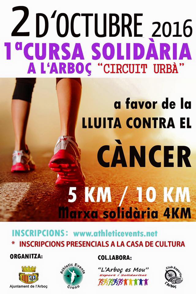 Ja estan obertes les inscripcions per a poder participar en la 1a Cursa Solidària a favor de la lluita contra el càncer que se celebrarà a l’Arboç el 2 d’octubre.