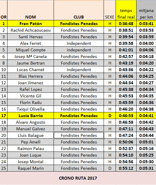 IniciNotíciesCròniquesClassificació de la Crono Ruta 2017 Cròniques Classificació de la Crono Ruta 2017 8 octubre 2017 5 FacebookXPinterestWhatsApp Aquí us deixem amb la classificació de la Crono Ruta 2017, celebrada aquest matí guanyada pel Fran Patón i la Luci Barrio. FacebookXPinterestWhatsApp NOTÍCIES RELACIONADES Cròniques ABEL CHEBET POLVORITZA EL RÈCORD DE LA 10K DE VILAFRANCA AMB UN ESPECTACULAR 29:05 25 gener 2026 Cròniques FONDISTES PENEDÈS, PROTAGONISTES A LA MITJA MARATÓ DE GRANOLLERS 18 gener 2026 Cròniques GRAN PARTICIPACIÓ DE FONDISTES PENEDÈS A LA 10K DE SITGES 11 gener 2026