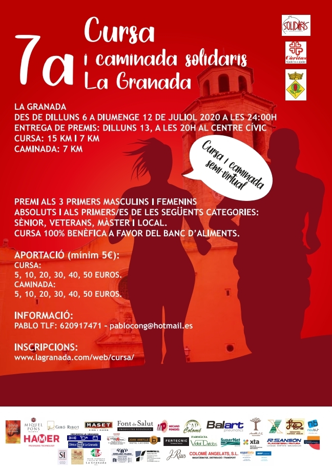La setena edició de la Cursa i Caminada Nocturna de la Granada es disputarà en format semi-virtual per adaptar-la a les excepcionals circumstàncies actuals. És una cursa que sempre ha destinat els seus beneficis a Càrites i, veient l’estat d’emergència social actual, ha adequat el format per poder seguir destinant-hi recursos ara que són més necessaris que mai.