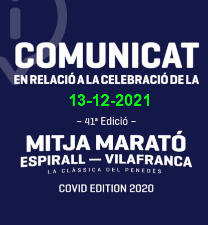 Aquest divendres s’ha confirmat que la Mitja Marató de l’Espirall, que s’havia programat pel diumenge 15 de novembre, en principi s’ajorna pels 13 de desembre, si aquesta data no es pugues celebrar, s’ajornaria de forma definitiva.