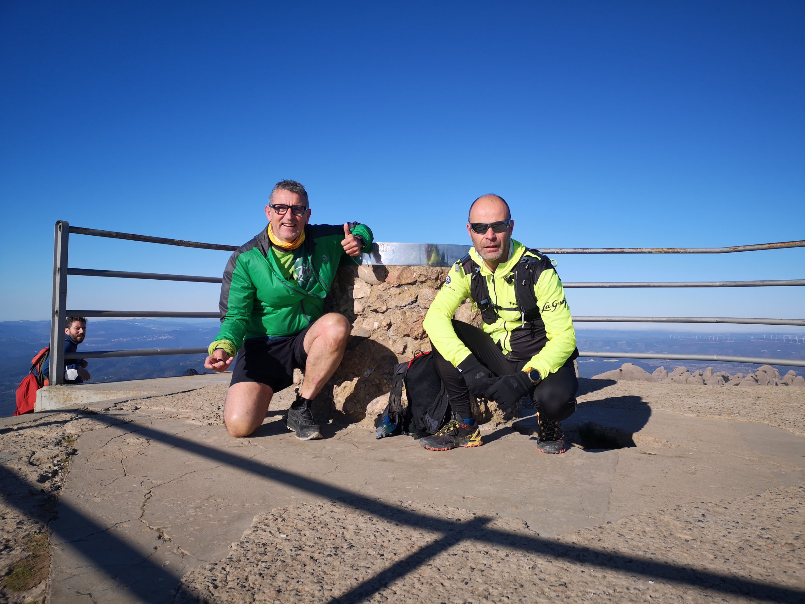 “Sota el so de les campanes del monestir hem començat a pujar per les escales, 1.200 esglaons, pla dels ocells, ermita Sant Jeroni i coronar el punt més alt de Montserrat , Sant Jeroni situat a 1.236m, no hi havia ningú i anaven gaudint al màxim, al arribar a dalt feia fred, menys del que pronosticaven, les vistes panoràmiques bestials, una passada, es divisava neu al Pirineu i al Montseny, també és veia perfectament el mar, una vegada hem fet la foto de rigor tocava baixar per Sant Joan a un bon ritme, ha sigut una forma de carregar piles tornant a la muntanya màgica”.