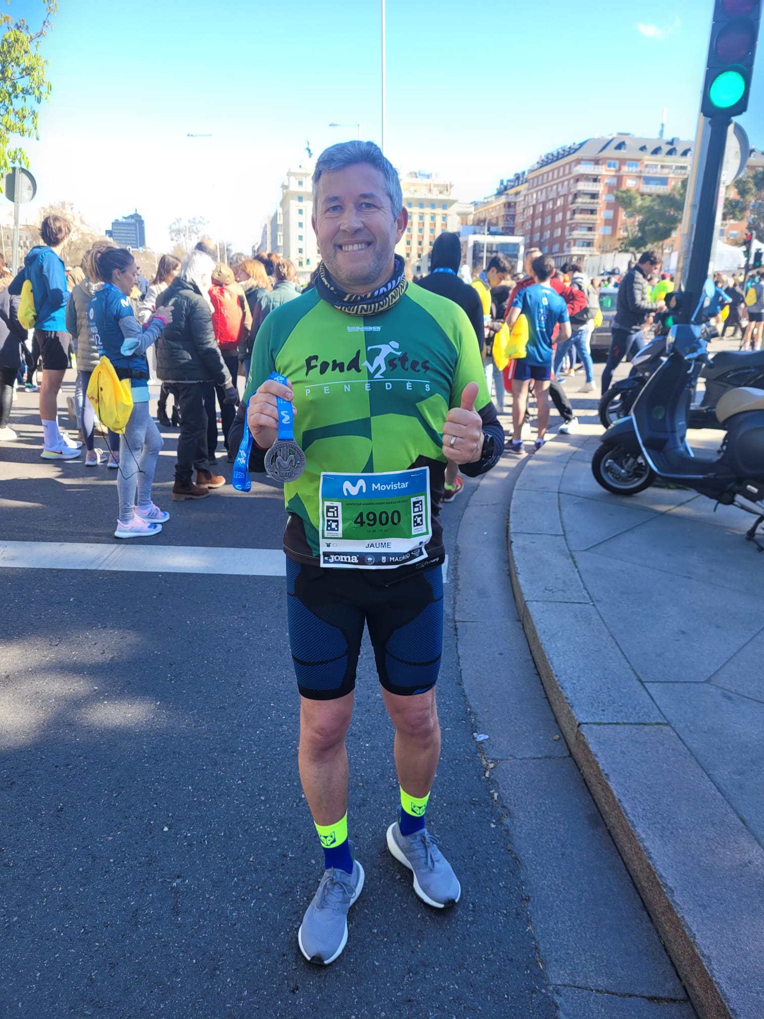 “Desprès de dos anys he tornat a fer una mitja, aquest cop a Madrid, amb 17000 corredors i sortida a les 9.15, amb una temperatura propera a 1 grau. Circuit ondulat amb els 4 primers km recorrent la Castellana de pujada i acabant els dos últims també amb pujada. Tot i així molt content del temps aconseguit, de les sensacions i d’haver tornar a aquesta distancia”.