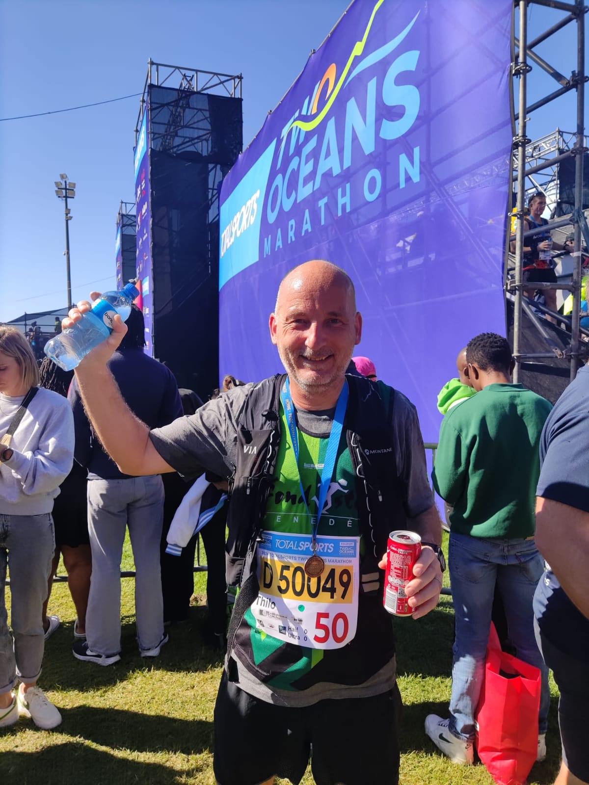 A partir del km 44 era un sufrimiento porque empezó la subida más fuerte de la carrera. ¡Pero llegué al final en 5h 32m muy contento, había realizado mi primera carrera de 56km, los últimos metros sobre el césped del estadio de rugby! ¡Es la carrera más grande de África y sin duda, la organización, animación, los servicios (avituállenlo casi cada 2km) son impresionantes, además las vistas panoramicas la hace ser una de las más bonitas del mundo!